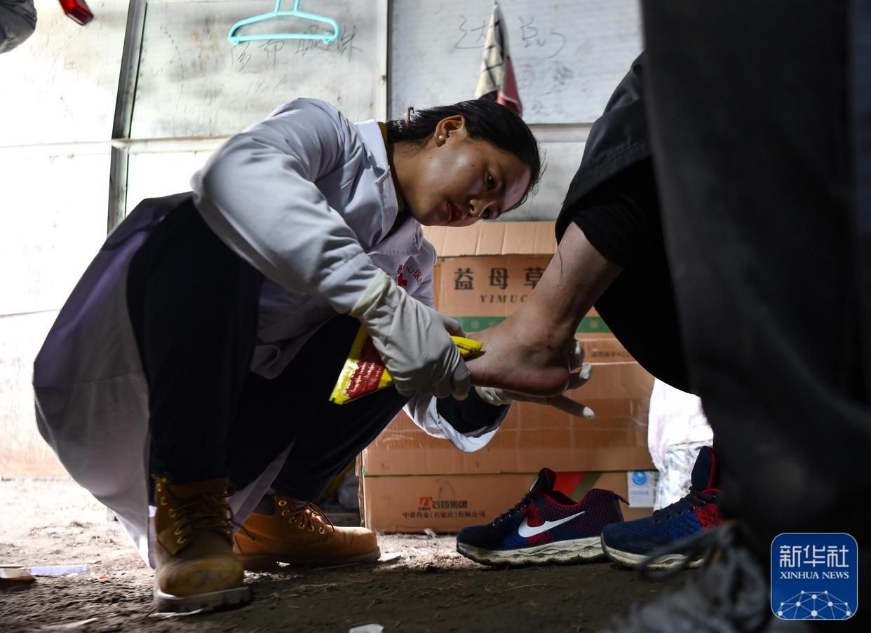 西藏那曲市比如縣良曲鄉(xiāng)然木塘村蟲草采集點(diǎn)的營地里,政府為采集點(diǎn)配備的醫(yī)護(hù)人員在給采集蟲草時受傷的牧民治療(5月26日攝)。新華社記者 晉美多吉 攝