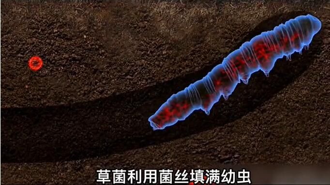 草菌利用菌絲填滿幼蟲,直接把它們變成僵蟲,然后等到春暖花開(kāi)之際再控制僵蟲的身體,爬出土壤,并從頭不長(zhǎng)出一個(gè)棍棒狀的子座,在子座上會(huì)有許多孢子,等到孢子成熟后便會(huì)撒向土壤中繼續(xù)下一個(gè)循環(huán)。